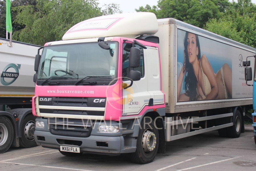 A Boux Avenue Ltd. branded DAF CF delivery lorry parked at Abergavenny Bus Station lorry park. Boux Avenue Ltd. is a well-known UK-based lingerie and nightwear retailer, established in 2011. The lorry features the company’s signature pink and white branding, along with an advertisement panel showcasing a model in Boux Avenue’s luxury lingerie. A striking transport and retail industry image for logistics enthusiasts, advertising collectors, and commercial transport historians.