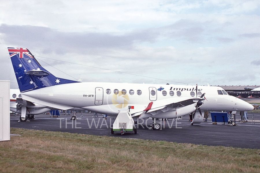 This photograph, taken at Farnborough Airshow in September 1994, features an Impulse Airlines British Aerospace Jetstream 41 with the registration VH-AFR. The aircraft is painted in a white livery with an Australian flag on the tail, representing the regional Australian airline Impulse Airlines. It is parked on display, with protective covers on the propellers and sensors, indicating it is part of the static exhibition at the airshow. The background includes airport infrastructure and other aircraft on display.