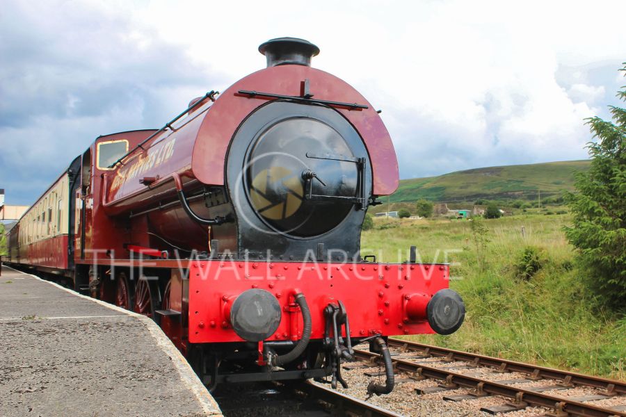 A striking photograph of the Austerity J94 0-6-0ST steam locomotive, Mech Navvies 71515, standing at Furnace Sidings Railway Station on the Pontypool and Blaenavon Heritage Railway. The locomotive is seen facing towards its next stop at The Whistle Inn and Park Station, set against the stunning backdrop of the South Wales landscape. A perfect print for steam railway enthusiasts, heritage train collectors, and lovers of classic rail photography. Available as a high-quality print from The Wall Archive.