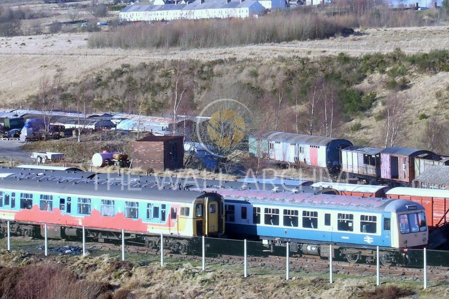 This photograph captures a view of Furnace Sidings at the Pontypool and Blaenavon Railway, featuring two British Rail Class 101 Diesel Multiple Units (DMUs) alongside various heritage railway stock. Furnace Sidings is the main operational hub of the Pontypool and Blaenavon Railway (PBR), located within Blaenavon’s UNESCO World Heritage Site.