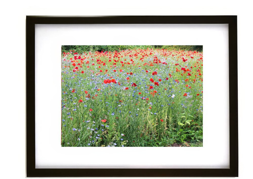This framed art print of poppies in Crickhowell Recreation Ground captures a fleeting early-summer moment below The Tump and the ruins of Crickhowell Castle. The vivid red poppies contrast beautifully with surrounding wildflowers and greenery, creating a scene that feels both natural and deeply rooted in local history.