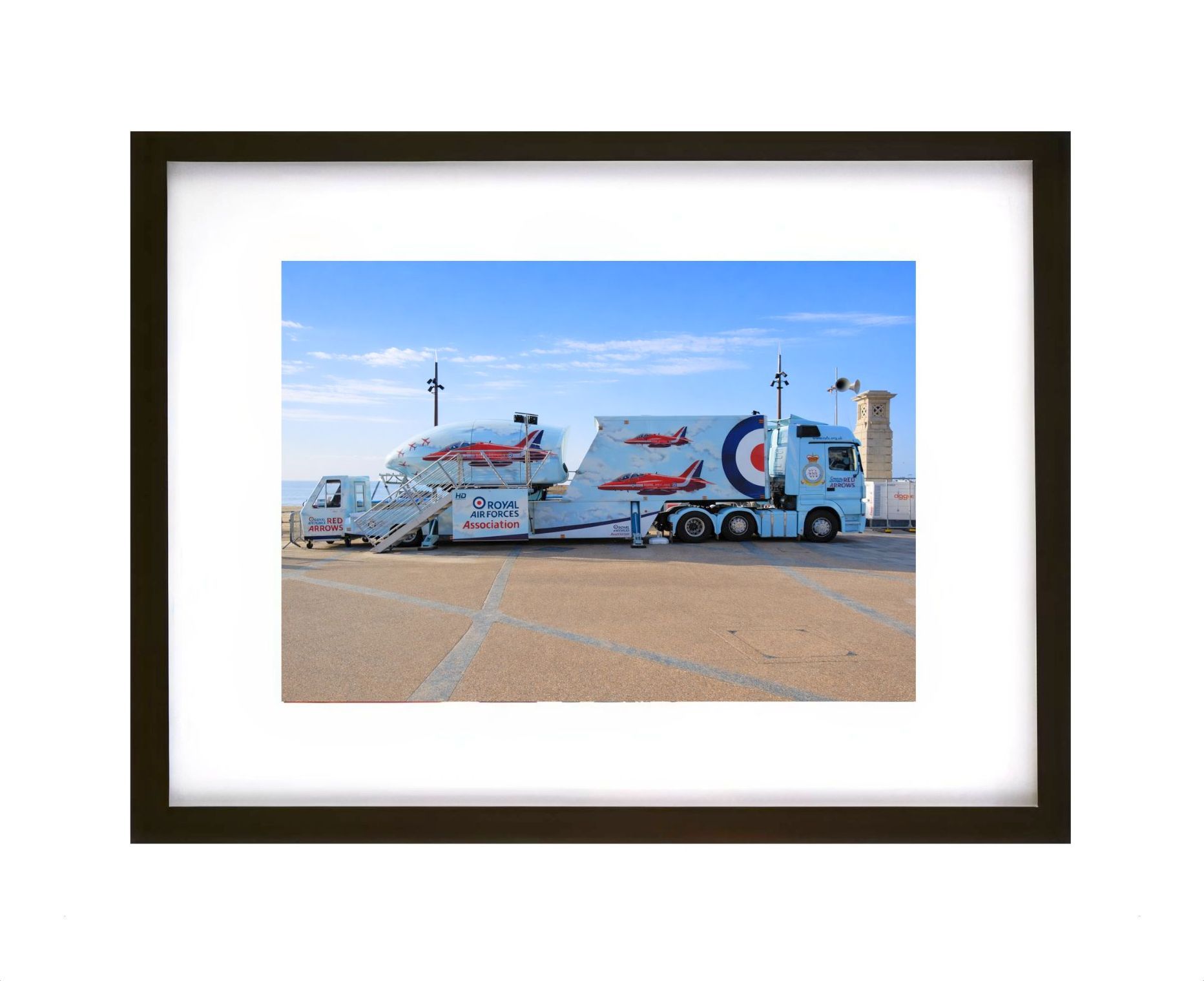 The image features the official Red Arrows Association promotional vehicle positioned against the open coastal backdrop, highlighting Britain’s proud aviation heritage and the enduring popularity of the RAF’s world-famous aerobatic team.