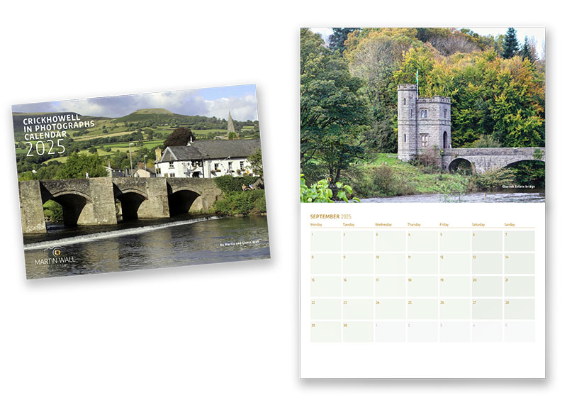 Twelve full page scenes of the Crickhowell area in a smart wall hanging calendar with A4 pages opening up to A3 size.