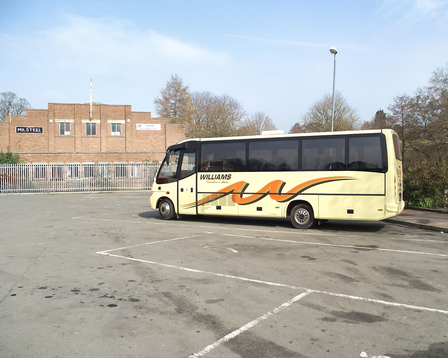 Abergavenny Bus Station in 2005 showing a Williams coach from Brecon with Mill Steel in the background, now demolished and replaced with retirement homes