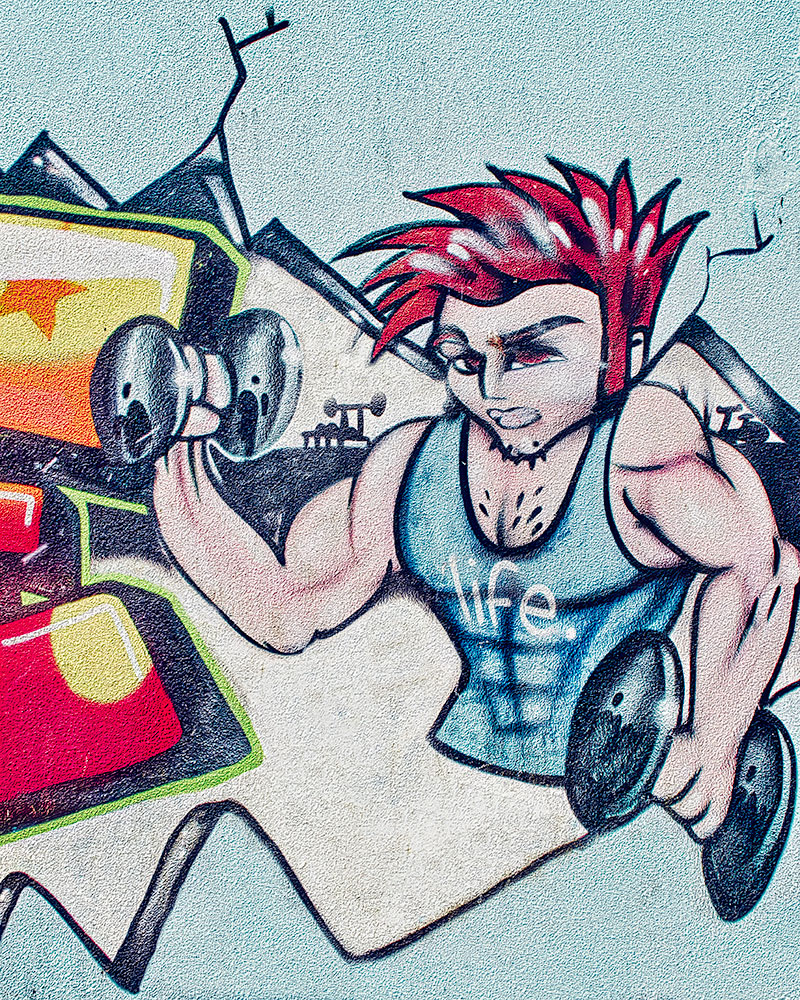 This vibrant piece of graffiti art was located at the Brynmawr Nantyglo Sports Centre prior to its demolition. The bold design features a muscular character lifting dumbbells, with dynamic colors and expressive strokes symbolizing strength, energy, and vitality.