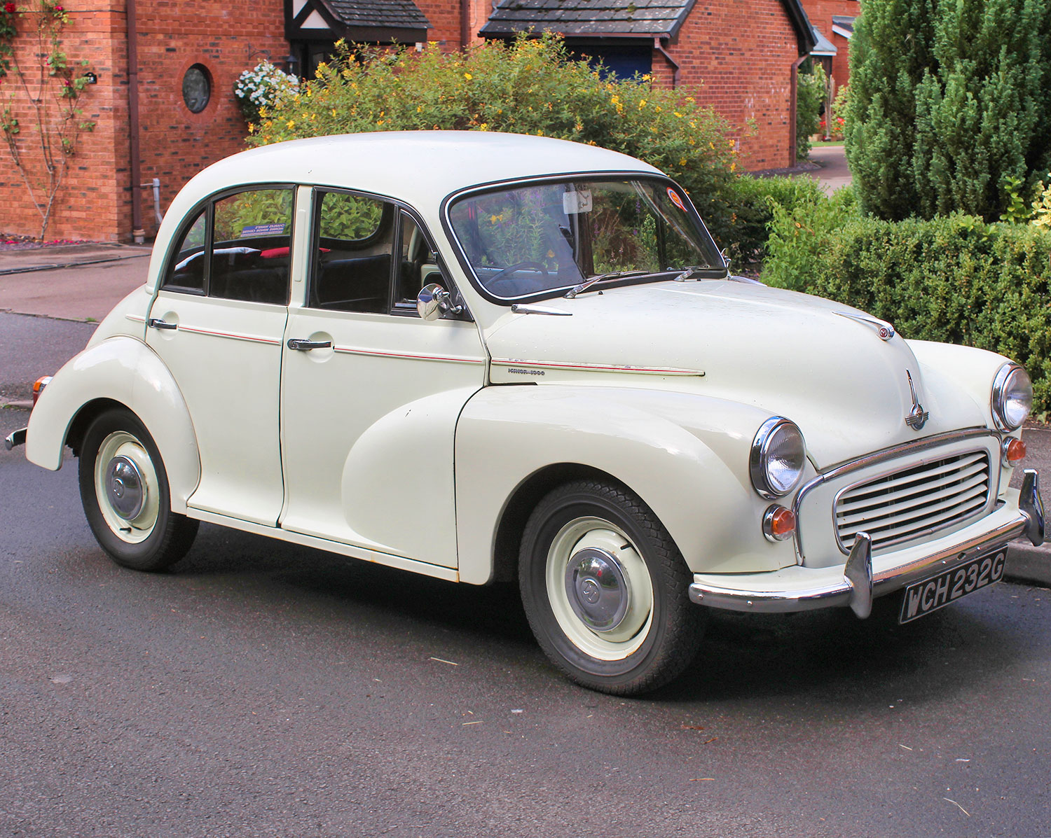 This image showcases a classic Morris Minor, registration VCH 232G, a hallmark of British motoring from the 1960s. With its timeless design, rounded fenders, and chrome accents, the Morris Minor became one of the most beloved family cars in post-war Britain. Known for its practicality and reliability, it holds a special place in automotive history. The serene village backdrop, with brick houses and greenery, adds to the nostalgic charm of this meticulously preserved vehicle.