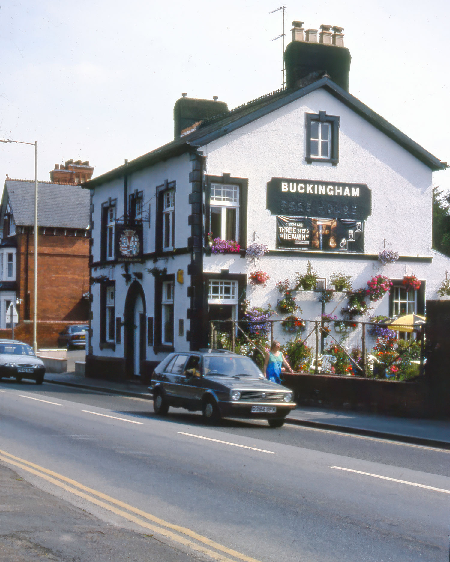 This nostalgic photograph features The Buckingham Inn, a charming pub in Hereford, known for its traditional architecture, flower-adorned exterior, and welcoming ambiance. Once a beloved local spot, this historic pub has since been repurposed and is now a Tesco store, reflecting the changing face of local communities.