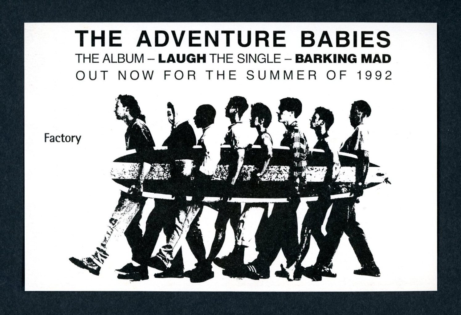 Step back into the vibrant indie music scene of the early 1990s with this vintage Factory Records advertisement promoting The Adventure Babies’ 1992 album “Laugh” and the single “Barking Mad.” Released under the iconic Factory Records label, known for its influence on post-punk, Madchester, and alternative music, this rare promotional piece is a must-have for music memorabilia collectors and Factory Records enthusiasts.