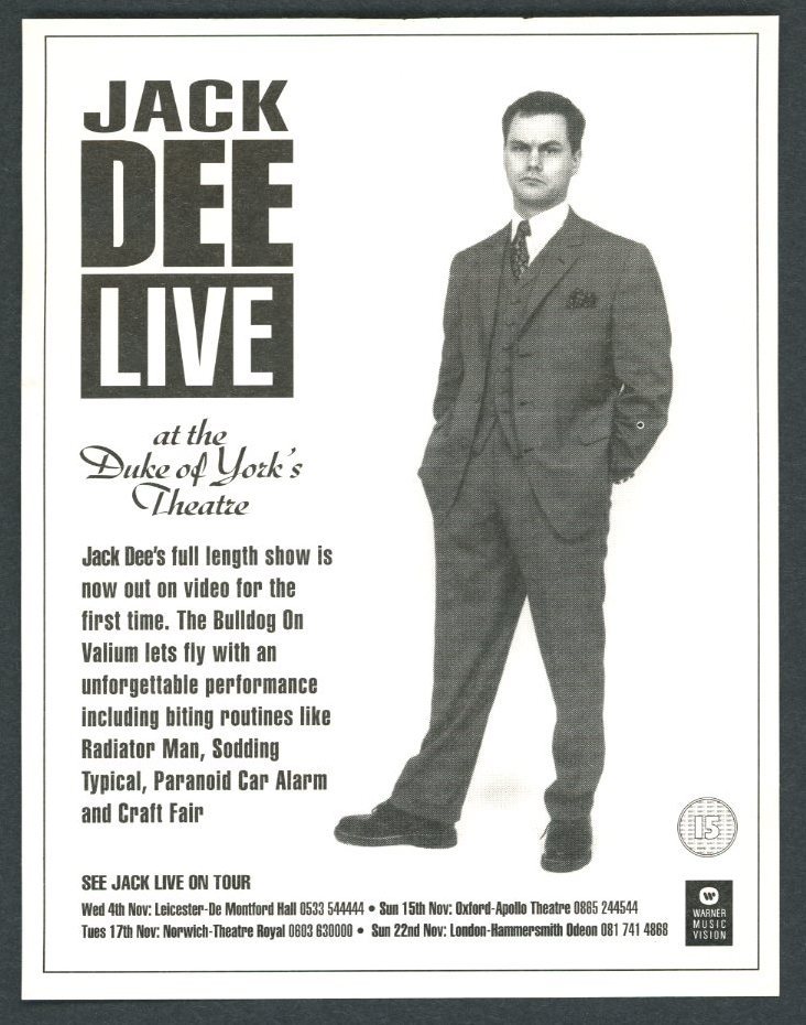 Step back into the golden age of 1990s British stand-up comedy with this vintage Jack Dee advertisement, promoting his live performance at Duke of York’s Theatre and the release of his full-length video. Known for his deadpan delivery and sharp wit, Jack Dee’s routines, including “Radiator Man,” “Sodding Typical,” and “Paranoid Car Alarm,” remain iconic in British comedy history.
