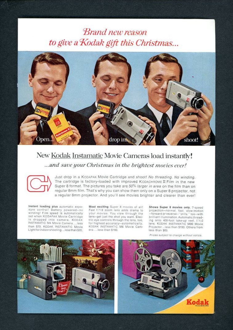 Step back in time with this original vintage Kodak advertisement, featuring the Kodak Instamatic Movie Camera and its revolutionary Kodapak cartridge system from the golden era of film. This nostalgic 1960s Kodak Christmas ad promotes the ease of loading film, highlighting the Super 8 format for brighter and clearer home movies. With its festive holiday theme, this Kodak ephemera is perfect for collectors of vintage photography memorabilia, retro camera ads, and film history enthusiasts.